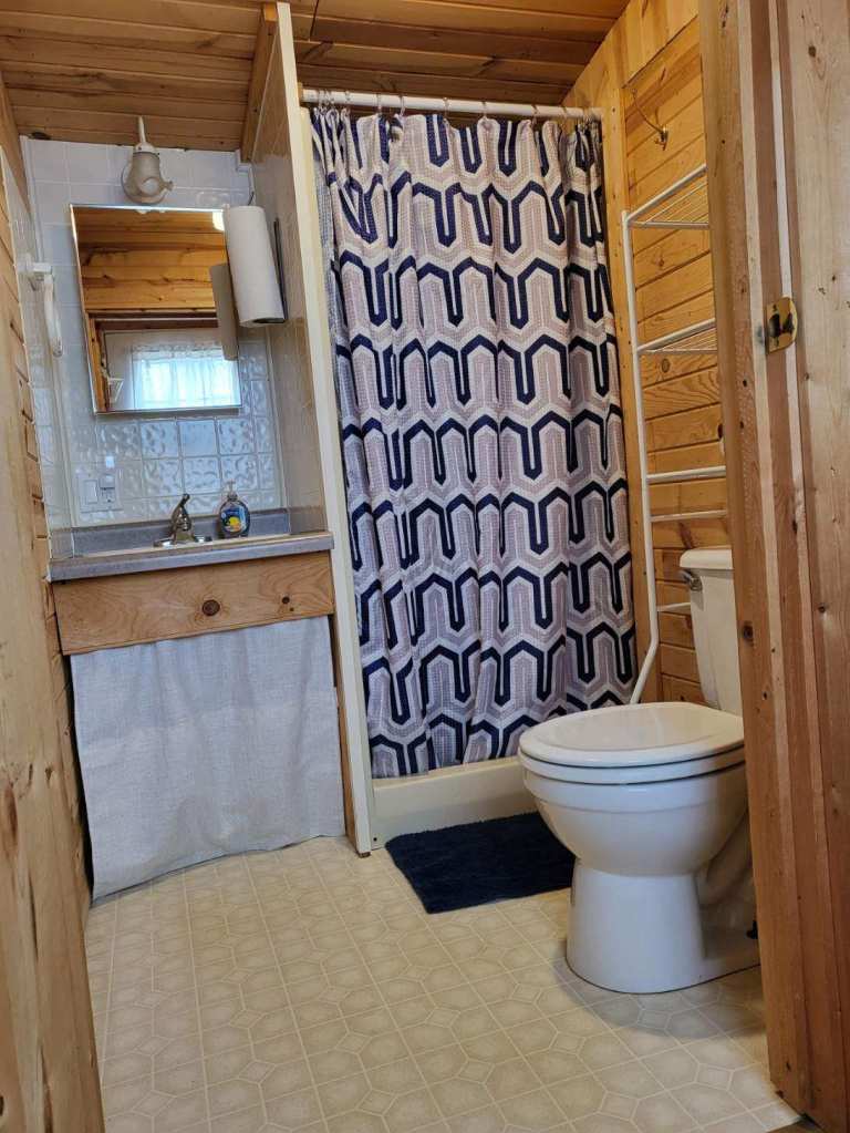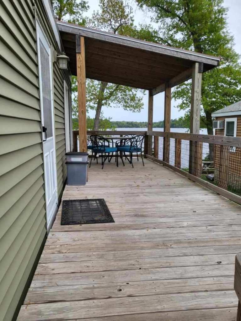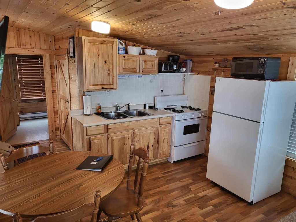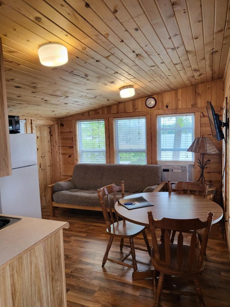 Cabin 2 is best suited for two people, but can sleep up to four. The cabin features a separate bedroom with a double bed. In the living room is a full size pull-out sleeper sofa. The kitchen, dining and living area is one open area. The kitchen is fully equipped with a full size refrigerator, stove, microwave, toaster and coffee maker. Attached is a large, covered deck featuring a table and chairs. Included in your stay is a dock, located just a few feet away from your cabin. A picnic table, fire pit and charcoal grill are also provided, including charcoal and lighter fluid. We also provide all bedding, including for pull-out sofas. We include towels for shorter stays but please bring your own towels for weeklong or longer stays.